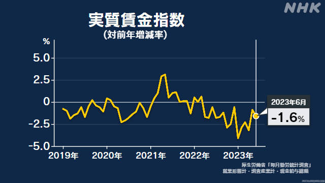 日本勞動者6月的實際工資與去年同期相比減少了1.6%,連續15個月減少,工資沒跑贏物價(圖源:NHK)