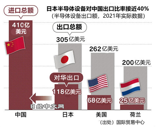2021年,日本半導體設備對中國出口比率近40%(圖源:日經中文網)