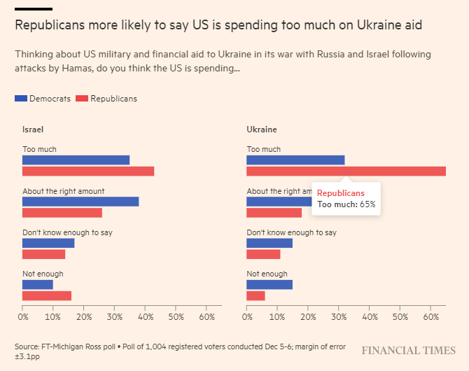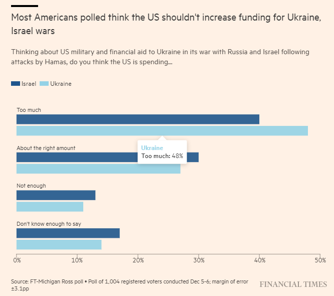 然而,英國《金融時報》與密歇根大學羅斯商學院(FT-Michigan Ross)聯合開展的月度調查顯示,認為美國在援助烏克蘭方面花費過多的選民佔比飆升至近50%,“突顯出美國國內支持的脆弱性”。