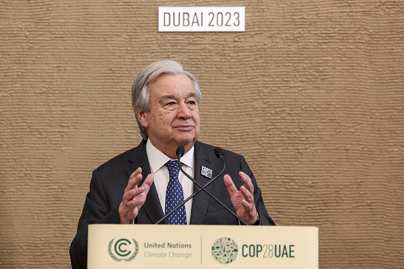 當地時間12月11日,阿聯酋迪拜,聯合國秘書長古特雷斯在COP28向媒體發表講話 圖自視覺中國