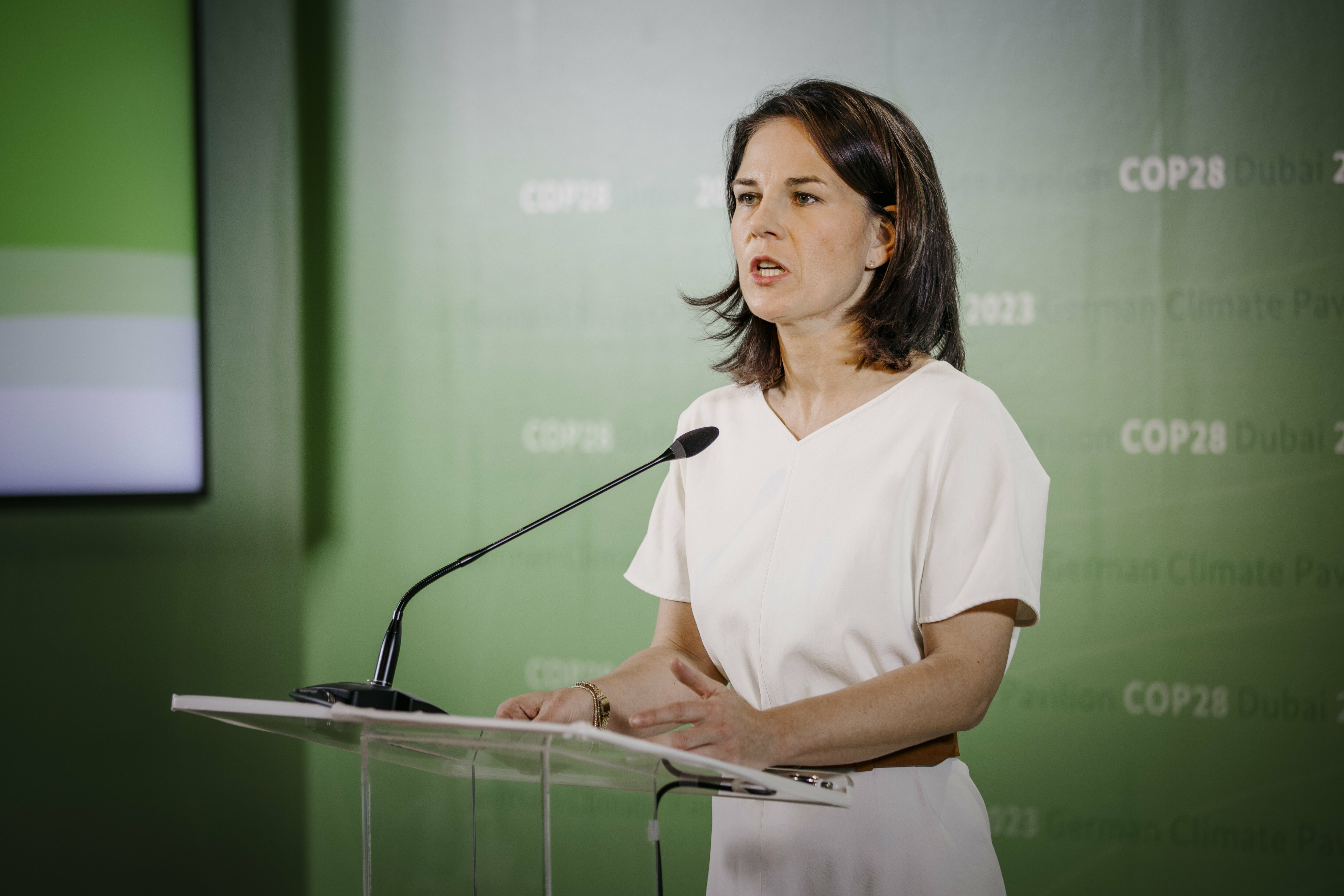 當地時間12月11日,德國外交部長貝爾伯克在迪拜舉行新聞發佈會 圖源:澎湃影像