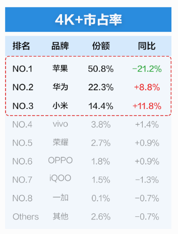 根據BCI公佈的數據,11月在國內售價4000元以上的手機市場中,蘋果iPhone的市佔率仍然達到了過半的50.8%,但同比下滑21.2%。以IDC數據作為對比,2023年上半年,蘋果在中國600美元(約合人民幣4380元)以上手機市場的份額高達67%。