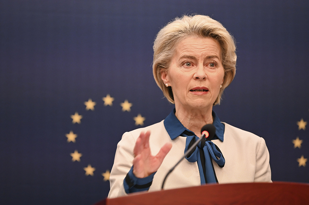 2023年12月7日,北京,歐盟委員會主席馮德萊恩出席第二十四次中國-歐盟領導人會晤並接受記者採訪。圖片來源:視覺中國