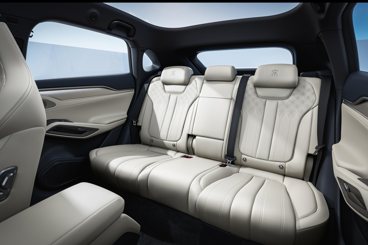 由中控台為軸,中控形成對稱設計。設計線條交錯,從主儀表台延續到門板及側圍,沒有過的冗雜元素堆疊,乘客被環抱其中。而中控面板雙層階梯式上揚,層次感豐富。宋 L 的車內軟材質包覆面積高達 85%,通過真皮、麂皮、水晶和紋路飾板的組合,整個內飾給人不錯的豪華氛圍感。