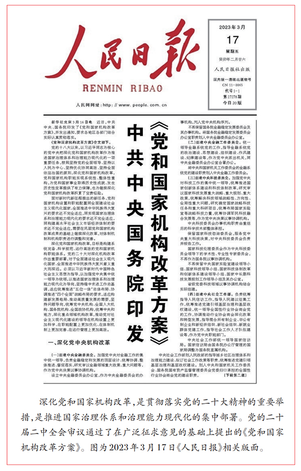 2023年2月,黨的二十屆二中全會審議通過《黨和國家機構改革方案》,推動黨對社會主義現代化建設的領導在機構設置上更加科學、在職能配置上更加優化、在體制機制上更加完善、在運行管理上更加高效。