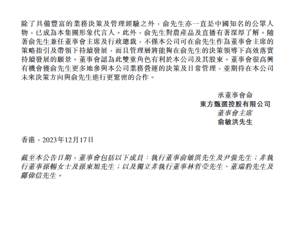此外,公告顯示,東方甄選董事會認為,俞敏洪除具備豐富的業務決策及管理經驗外,對農產品及直播有著深厚瞭解。俞敏洪兼任董事會主席與執行董事二職,有利於該公司及其股東。