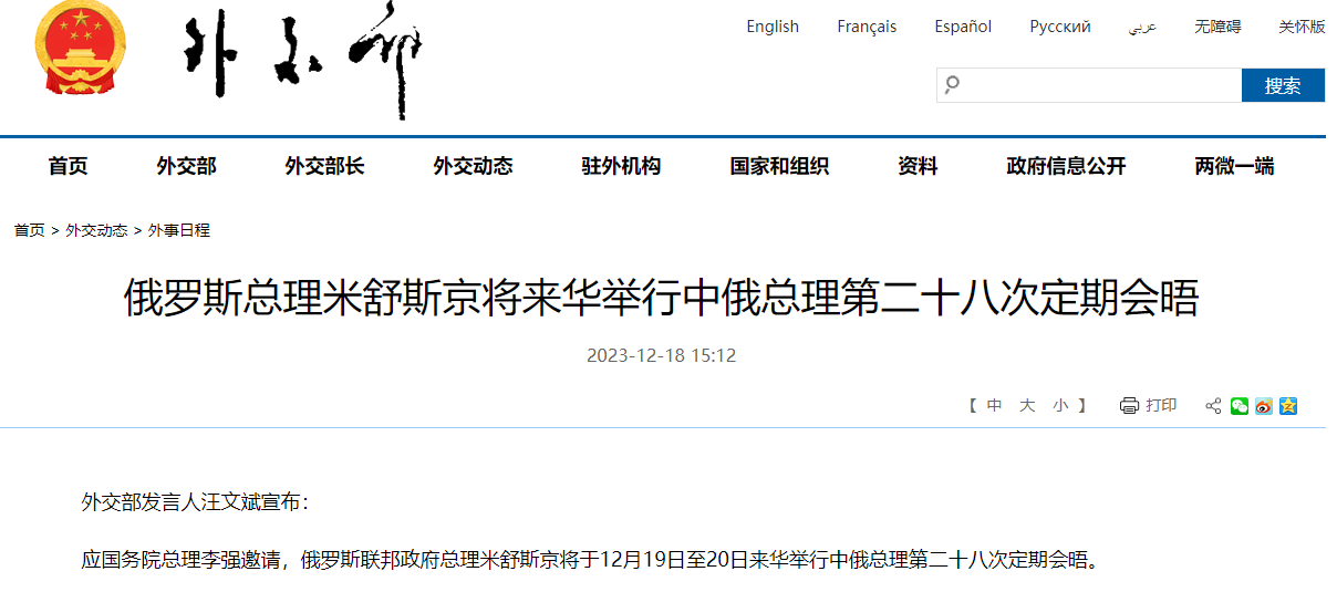 應國務院總理李強邀請,俄羅斯聯邦政府總理米舒斯京將於12月19日至20日來華舉行中俄總理第二十八次定期會晤。