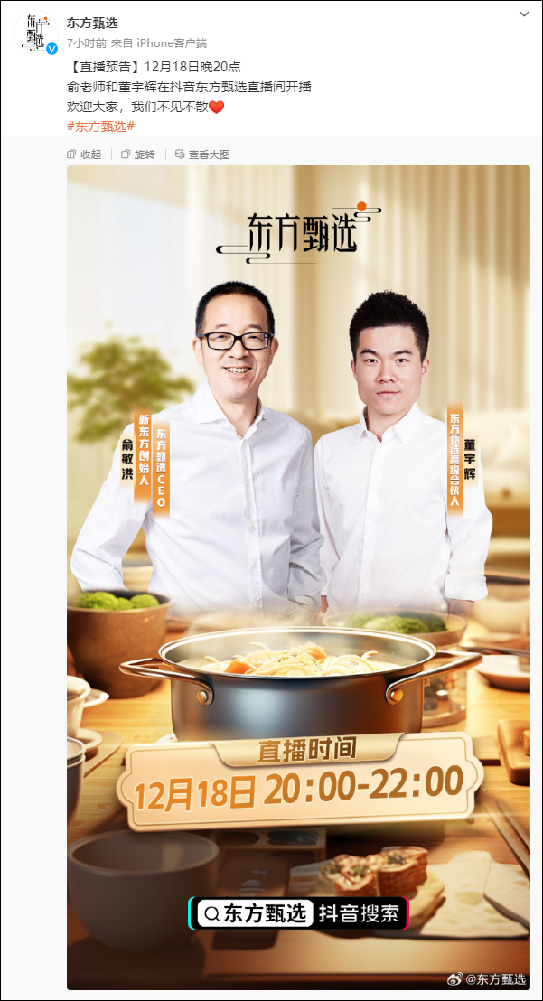 12月17日晚,@東方甄選 發佈直播預告稱,12月18日晚20點俞敏洪和董宇輝將在抖音東方甄選直播間開播。