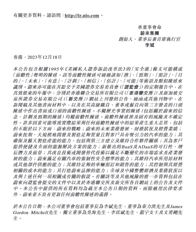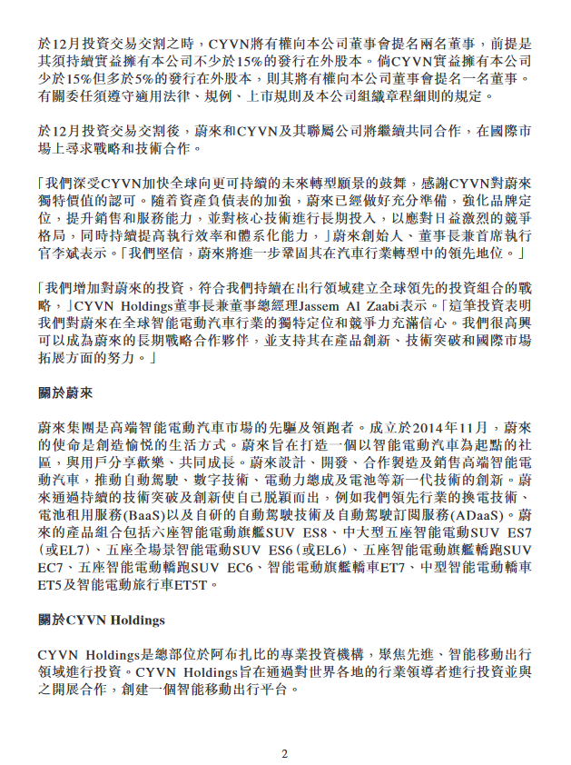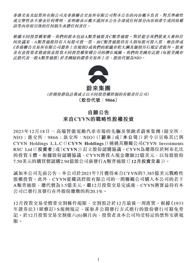 12月18日,蔚來在港交所發佈公告並宣佈與阿布扎比投資機構CYVN Holdings簽訂新一輪股份認購協議,CYVN Holdings將通過其附屬公司CYVN Investments以現金形式向蔚來進行總計約22億美元的戰略投資。此次投資完成後,蔚來和CYVN將繼續共同在國際市場上開展戰略和技術合作。