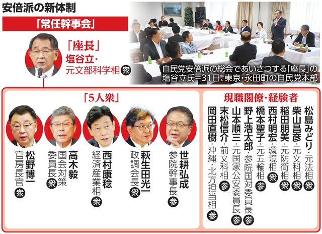 自去年7月安倍晉三突然遇刺身亡後,派系內始終無法推出一位適任的領導者,最終只能先成立一個常設執行委員會,進行集體領導。該委員會由15名有影響力的國會議員組成,上述五人正是其中的關鍵五人(“五人眾”)。