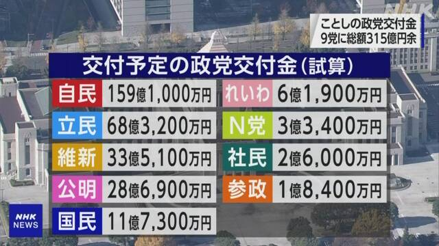 圖3:2023年日本各政黨“補助金”領取情況(NHK)