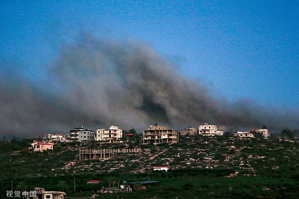 當地時間2023年12月15日,黎巴嫩南部邊境村莊Majdal Zoun遭到以色列襲擊後,濃煙滾滾。(圖源:視覺中國)