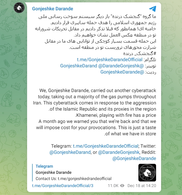 路透社和《以色列時報》提到,近年來,伊朗的加油站、鐵路系統和工業遭受了一系列網絡攻擊,而“掠食麻雀”組織多次宣佈對事件負責。