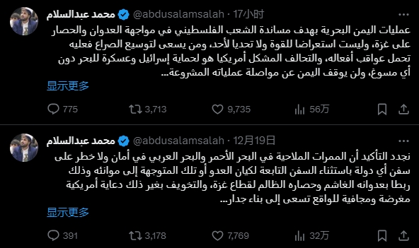 根據路透社和半島電視台報道,也門胡塞武裝首席談判代表兼發言人阿卜杜勒-薩拉姆(Mohammed Abdel-Salam)19日在推特發佈聲明稱,美國等國家組建海上聯軍,對外宣稱是“為了保護紅海海上航行”,實際卻是“為了以色列實體及以色列船隻”。