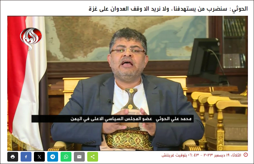 也門胡塞武裝高級官員阿里·胡塞(Mohammed Ali al-Houthi)同日接受伊朗“阿拉姆”電視台節目採訪稱,哪個國家針對胡塞武裝,哪個國家的船隻就會成為該組織的攻擊目標,他們會“瞄準所有來自針對該組織採取行動的國家的船隻”。