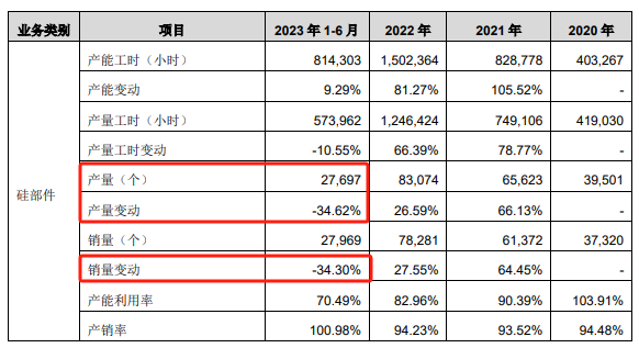 但回覆函顯示,盾源聚芯硅部件2023年上半年產量為2.77萬個,同比下降34.62%;其銷量為2.8萬個,同比下降34.3%。那麼,盾源聚芯硅環2023年上半年銷量下降多少,值得關注。