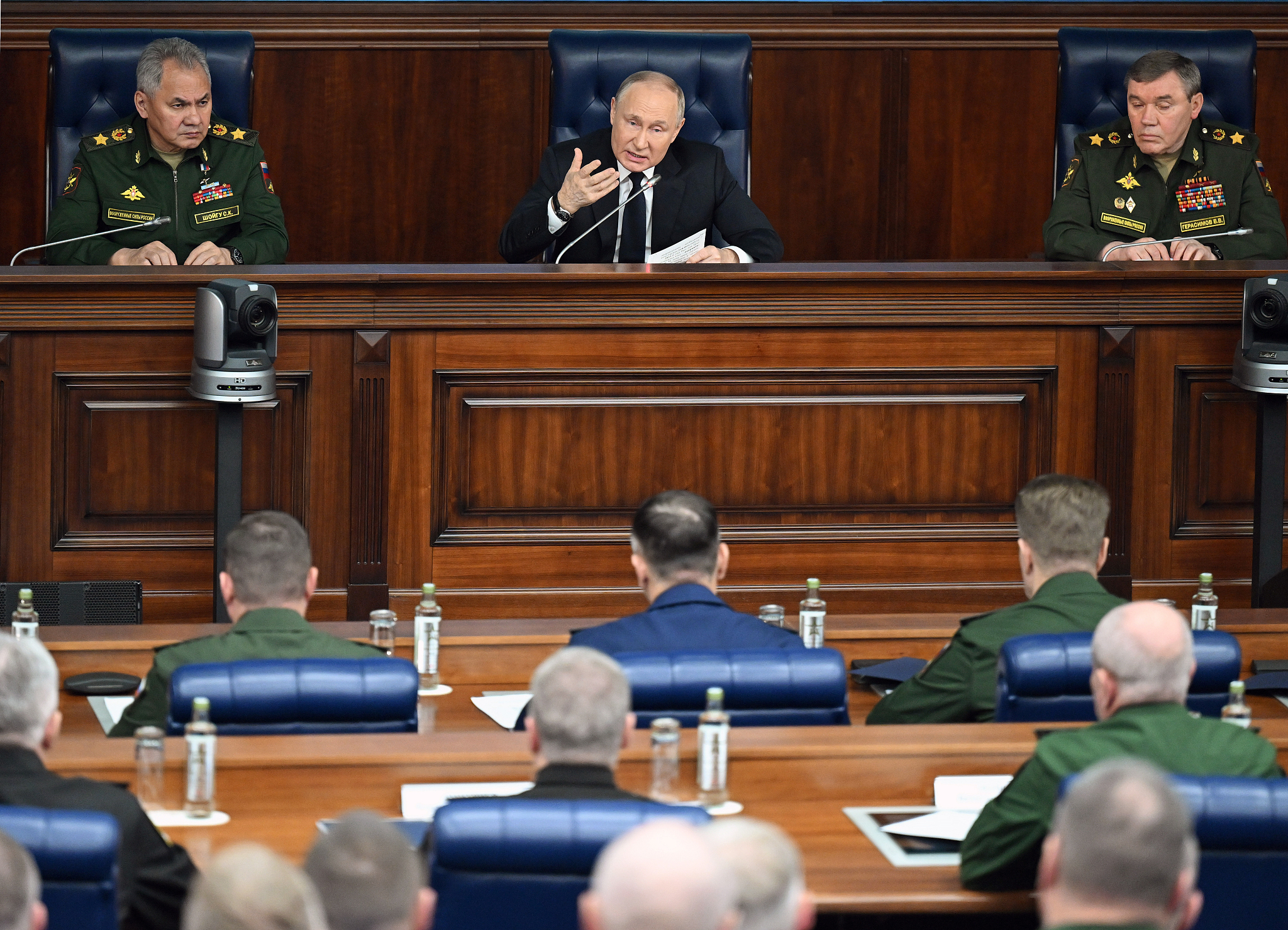 當地時間12月19日,普京與紹伊古出席俄國防部部務委員會擴大會議。 / 視覺中國