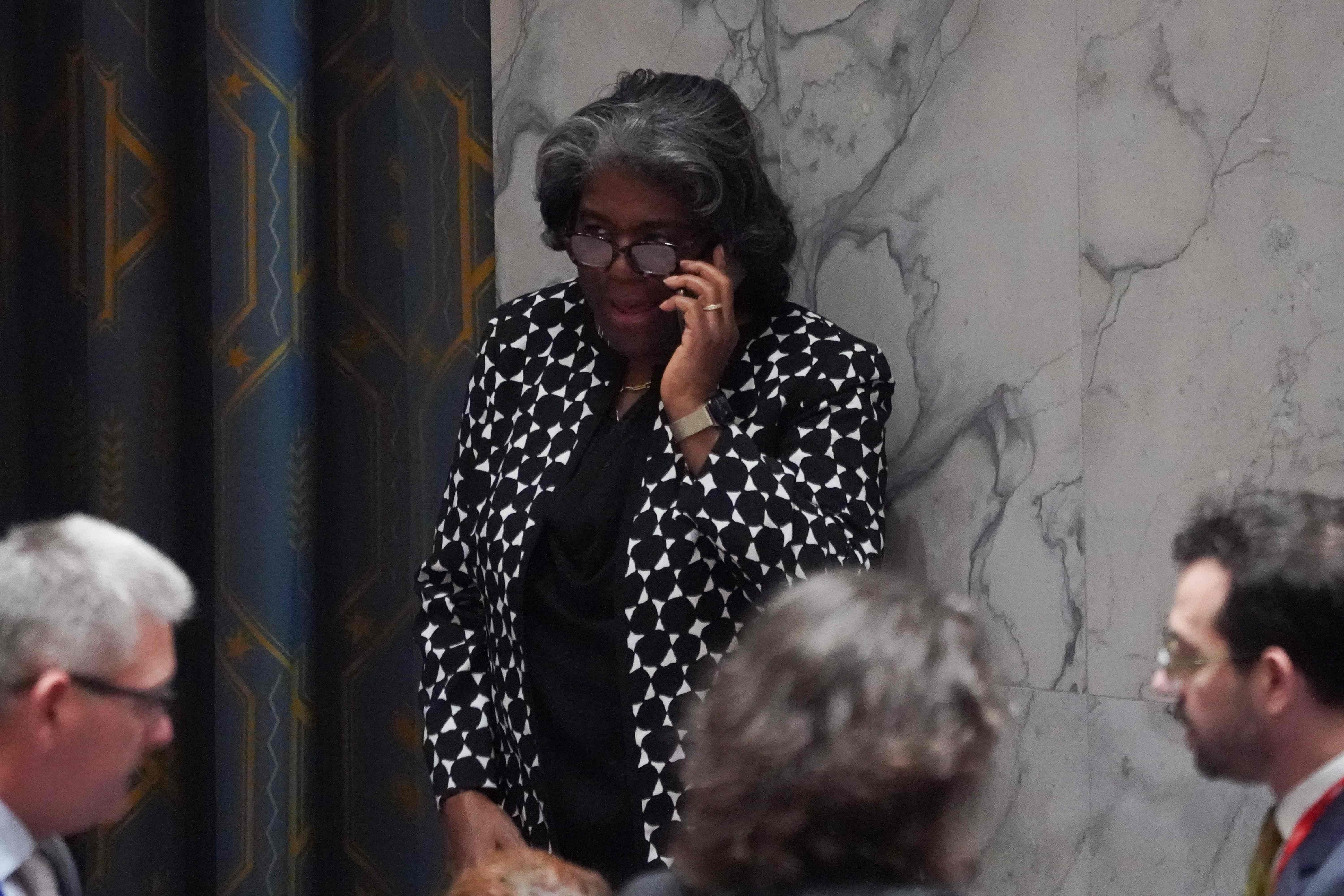 資料圖:安理會舉行會議前,美國常駐聯合國代表格林菲爾德在打電話。圖自視覺中國
