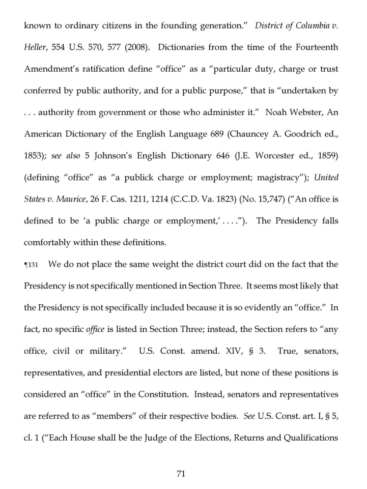 科羅拉多州最高院不同意Sarah B. Wallace法官的解讀,他們的理由是根據韋伯斯特詞典以及其他南北戰爭時期的詞典,“職務(office)”一詞的意思是“公權力機關的特殊職責”等,他們認為“總統職位”已經被包含在內了。