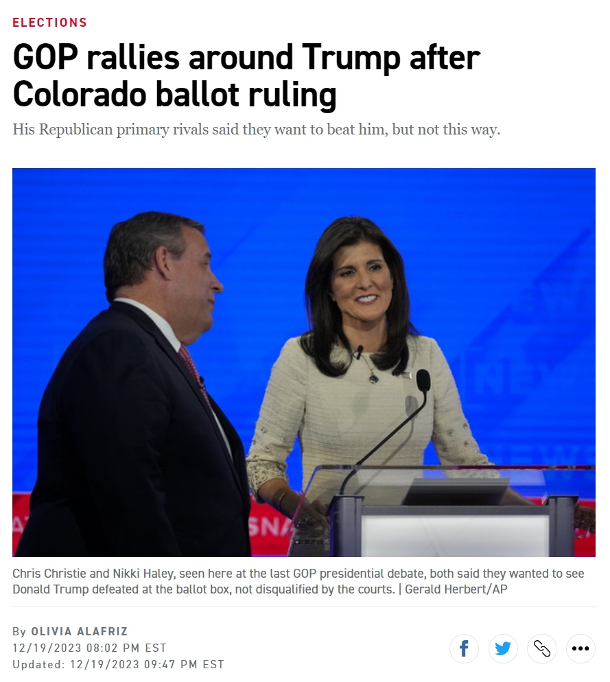 判決書的情況就簡單介紹到這裏,可以看出,它的説理存在比較重大的斷裂,實際上是有點孱弱的,怪不得一做出來以後,不止懂王,共和黨這邊全都炸鍋了,和懂王存在競爭關係的黑莉、德桑蒂斯、Vivek Ramaswamy甚至最愛罵懂王的新澤西州州長Chris Christie,不管真心還是虛情假意,全都大罵民主黨和科羅拉多州最高院。網紅出身的Vivek Ramaswamy甚至號召支持者和自己一起退出科羅拉多州初選。