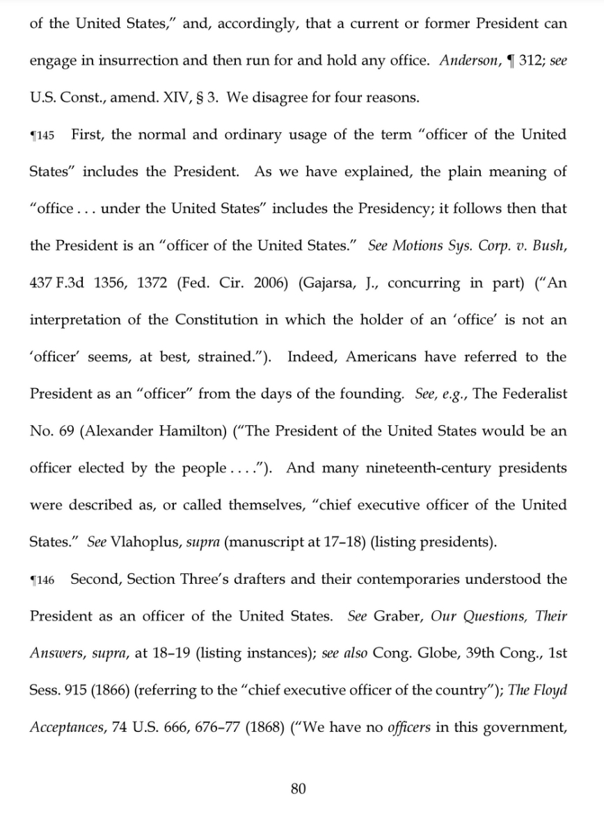 法官們説第十四修正案禁止任何宣誓要“支持美國憲法”但隨後參與叛亂的“美國官員(officer of the United States)”擔任任何“美國國家的或軍事的職務(office, civil or military, under the United States)”。他們要論證:1)總統職位是一個這樣的職務;2)總統是“美國官員”;3)總統誓言構成了“支持美國憲法”的誓言。