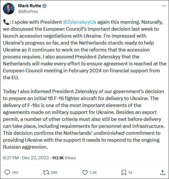 荷蘭看守首相呂特當天在X(原推特)上宣佈了這一消息:“今天,我向澤連斯基總統通報了我國政府決定準備向烏克蘭交付首批18架F-16戰鬥機的決定。”他強調,交付F-16是為軍事援烏協議中“最重要的內容之一”。