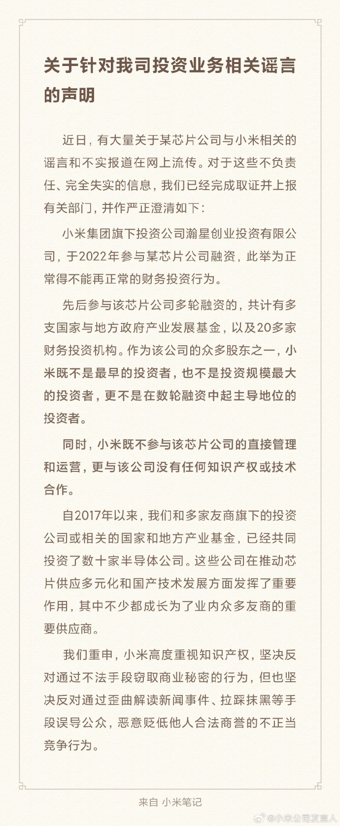 小米集團旗下投資公司瀚星創業投資有限公司,於2022年參與某芯片公司融資,此舉為正常得不能再正常的財務投資行為。