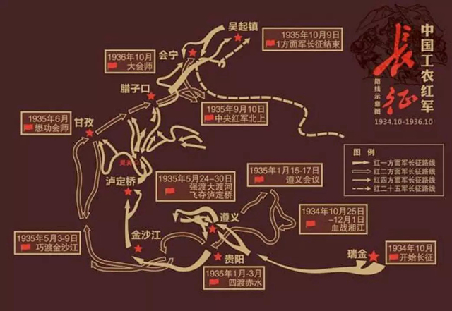 自1934年10月至1935年10月,中共中央率領中央紅軍主力部隊從江西中央蘇區出發,經過一年多的長途跋涉,來到陝北。“長征”名稱,是紅軍主力部隊到達陝北後才確定的稱謂,當初就是第五次反“圍剿”失利後的軍事戰略轉移,並且是落腳點多次改變的戰略轉移。
