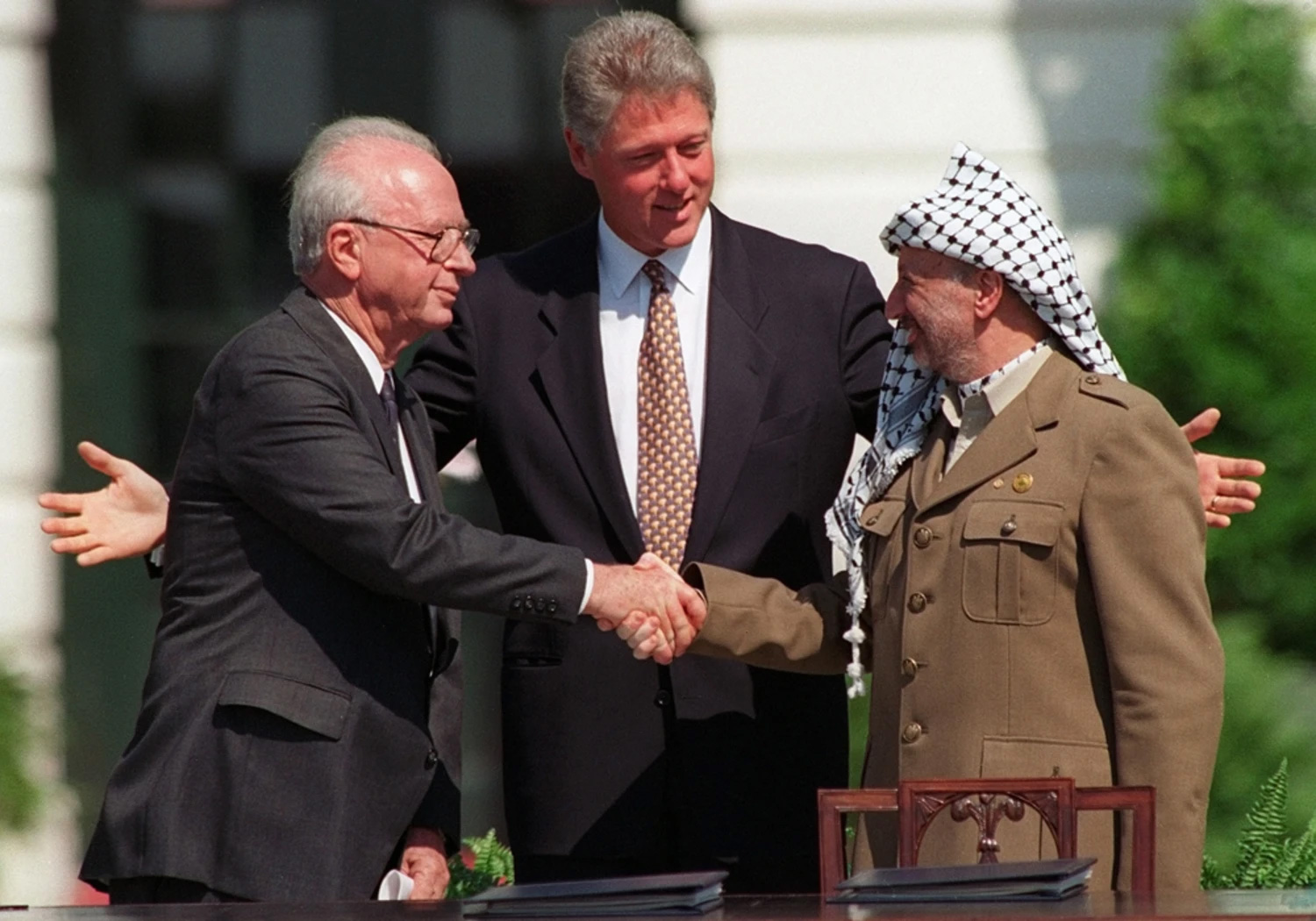 資料圖:時任以色列總理拉賓和時任巴勒斯坦解放組織主席阿拉法特在美國白宮草坪會面並簽署《奧斯陸協議》,中為促成協議達成的時任美國總統克林頓