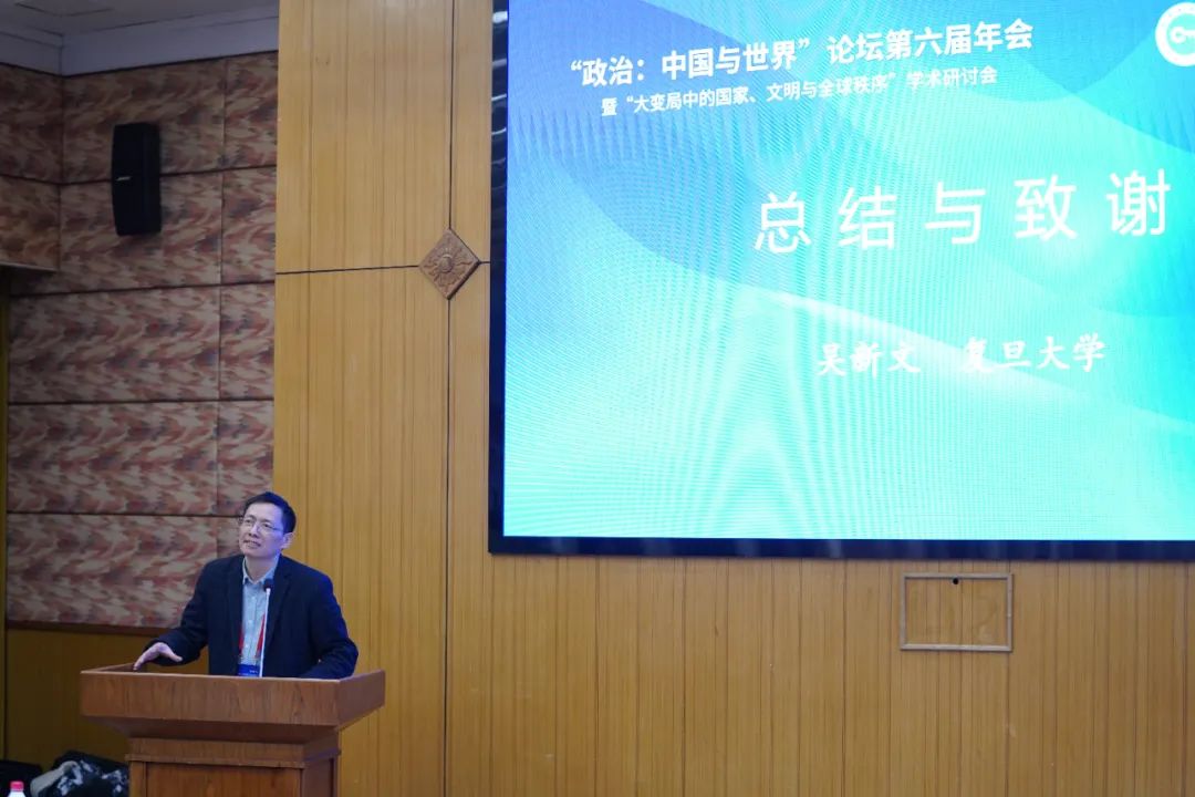 復旦大學中國研究院吳新文教授在最後總結時指出,本屆論壇年會堪稱一次“羣賢畢至、少長鹹集”的盛會,年會討論的主題、內容橫跨中西馬、文史哲、政經法,體現了國內學界在相關主題研究方面的廣度和深度,與會嘉賓有思想、有學術、有參與精神、有平等意識,確保本屆論壇年會取得了圓滿成功。最後,他以毛澤東主席的詩詞“雄關漫道真如鐵,而今邁步從頭越”“一萬年太久,只爭朝夕”表達對“政治:中國與世界”論壇的期許,並同與會嘉賓和青年學生共勉。