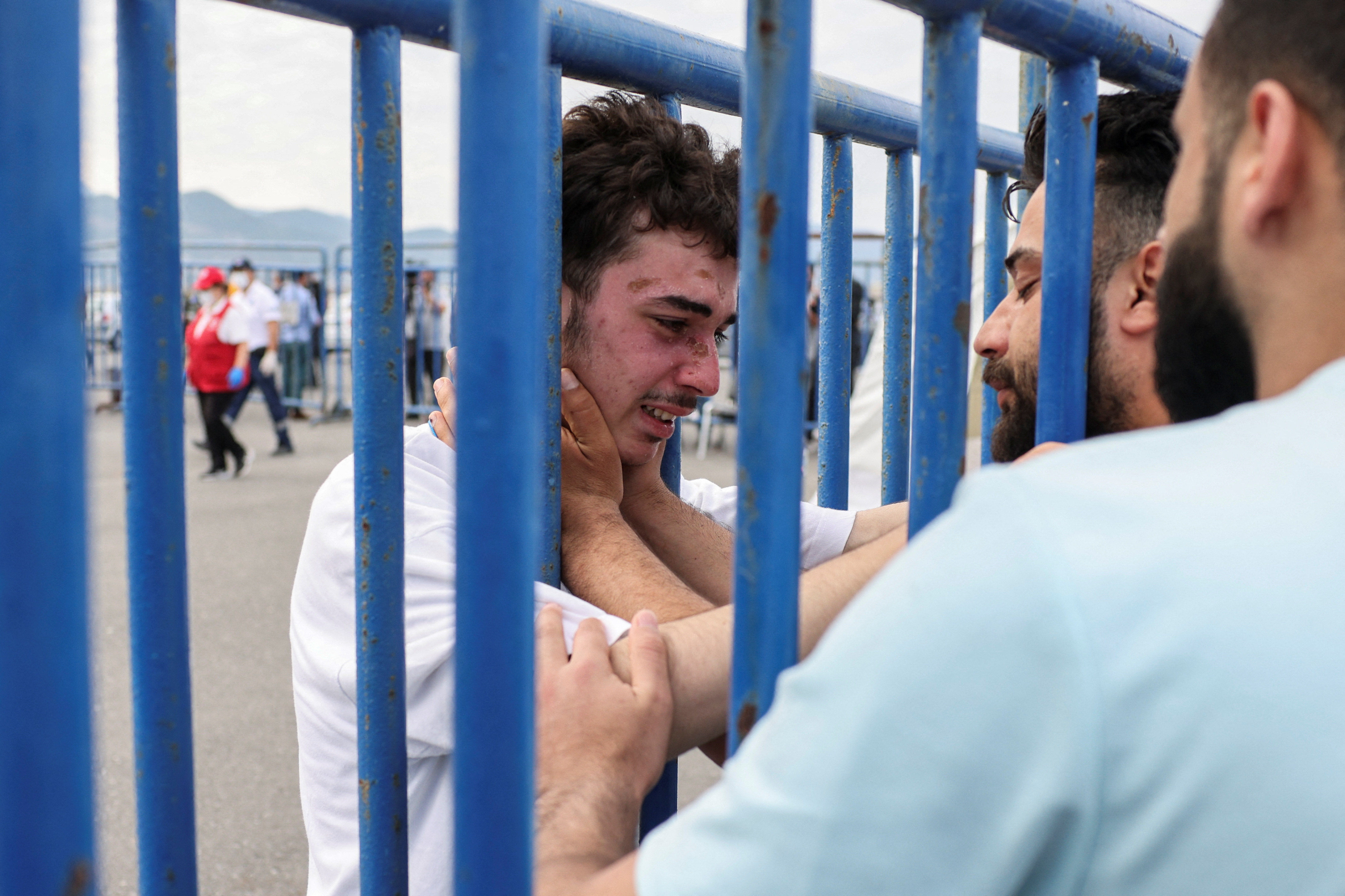 他們通過希臘警方在卡拉馬塔一家倉庫周圍設置的金屬柵欄相擁而泣,這是倖存者們過去兩天睡覺的地方。