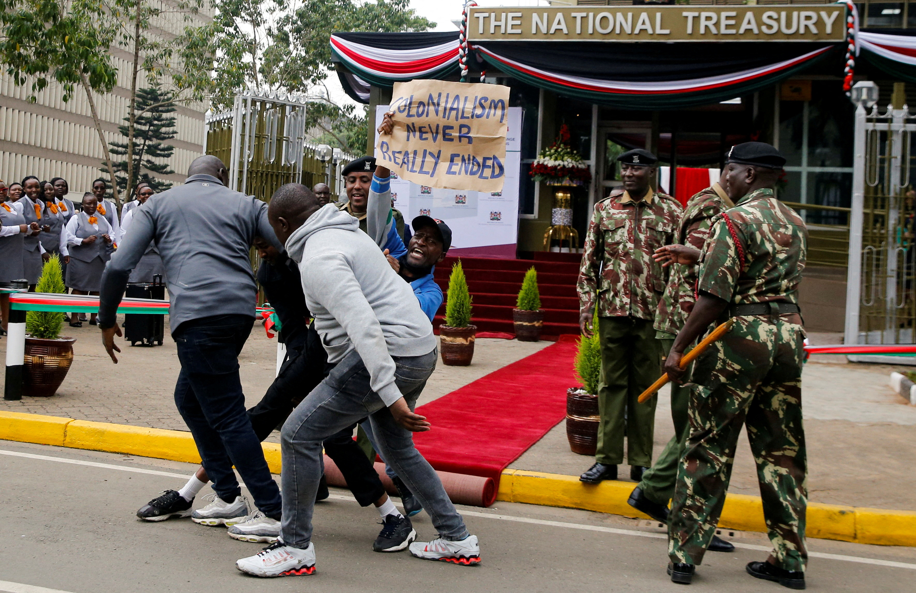 肯尼亞警察在內羅畢議會大樓外拘留一名肯尼亞社會政治活動人士,抗議政府提出的將提高各種税收的財政法案,2023年6月13日,肯尼亞。路透社/Monicah Mwangi/文件照片