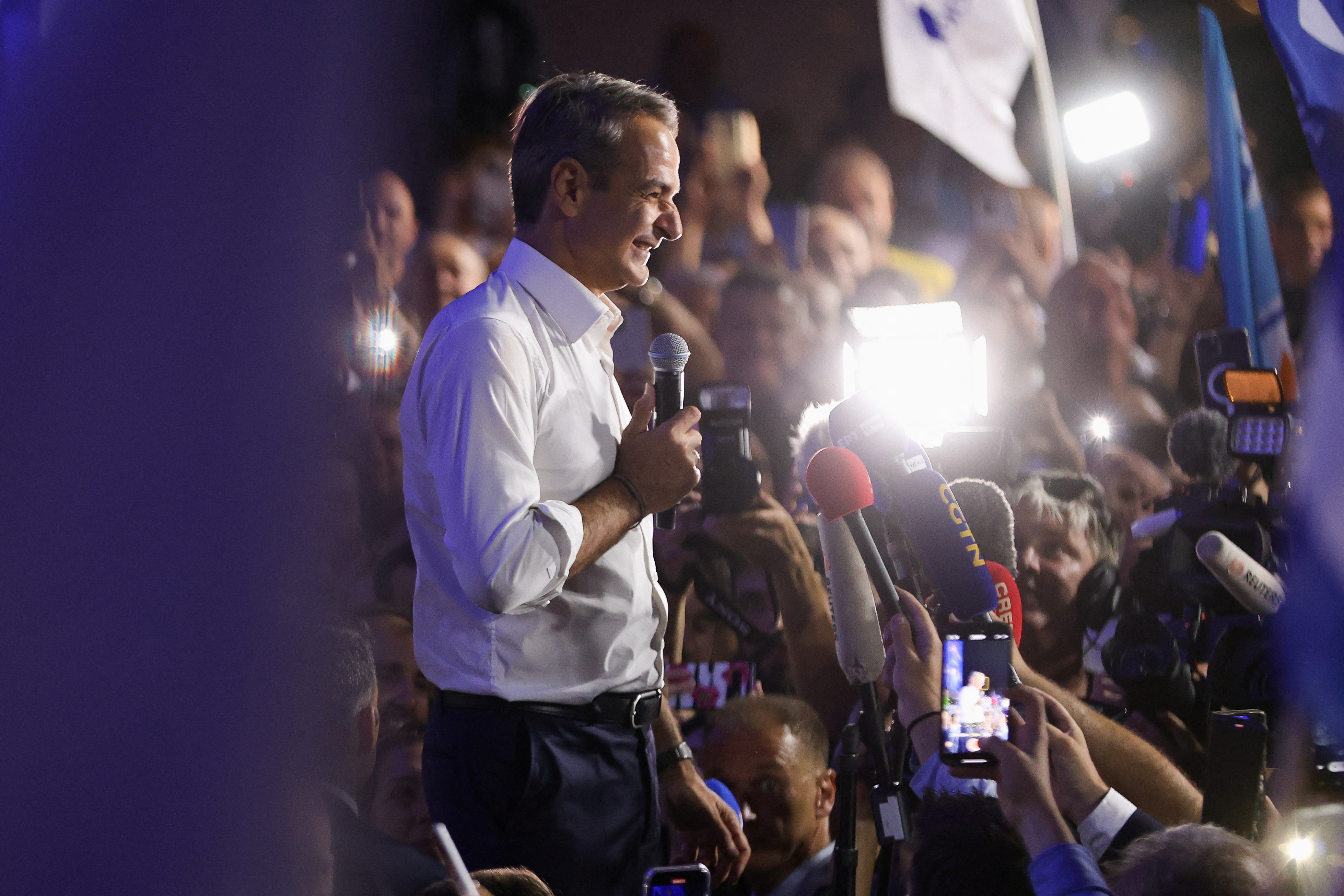 新民主保守黨領袖基里亞科斯·米佐塔基斯在希臘雅典的黨總部外對支持者講話,2023年6月25日。路透社/勞伊扎·弗拉迪