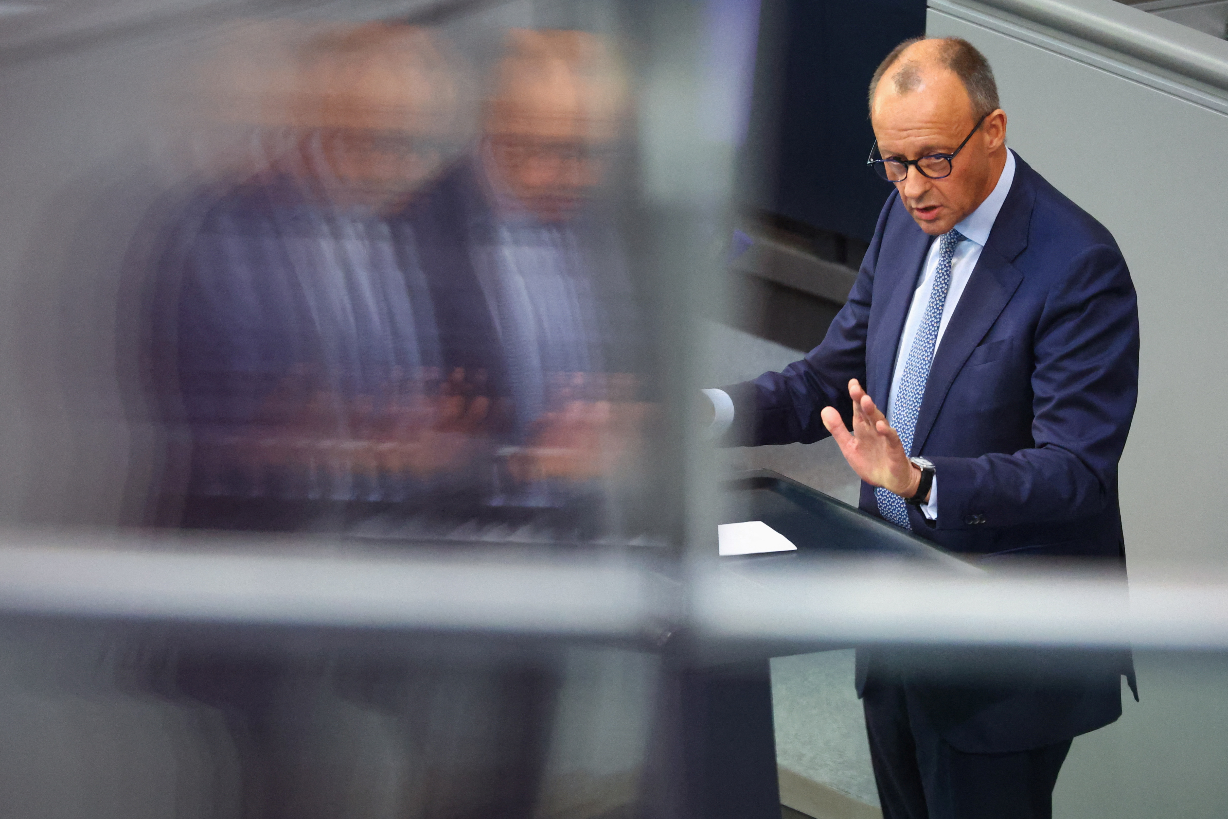 德國基民盟黨聯合領袖弗里德里希·默茲(Friedrich Merz)在2023年7月7日在柏林國會下議院Reichstag大廈發表講話。路透社/Fabrizio Bensch攝