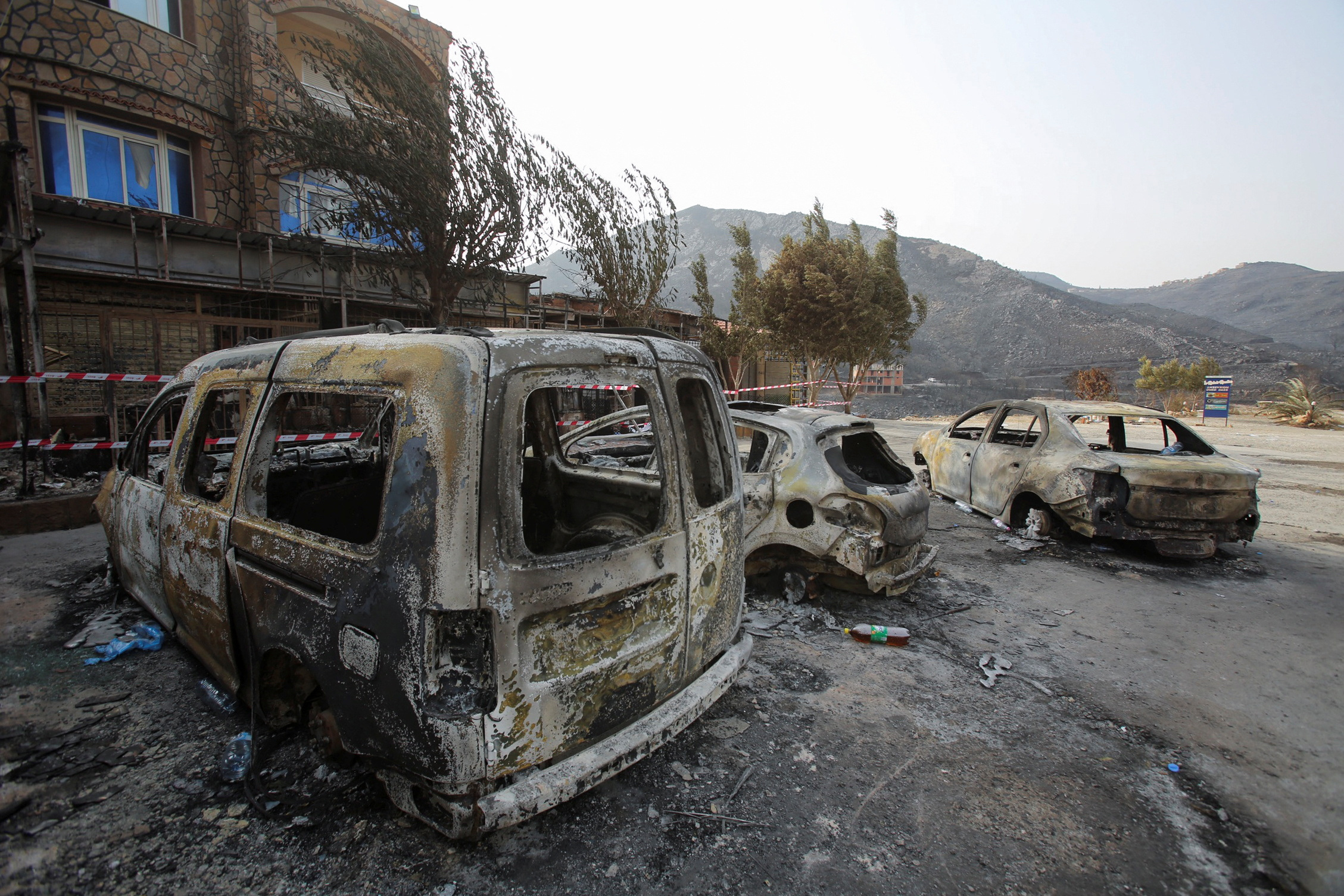 燒燬的車輛在阿爾及利亞貝賈亞的森林大火後的照片。路透社/拉姆齊·布迪納 攝