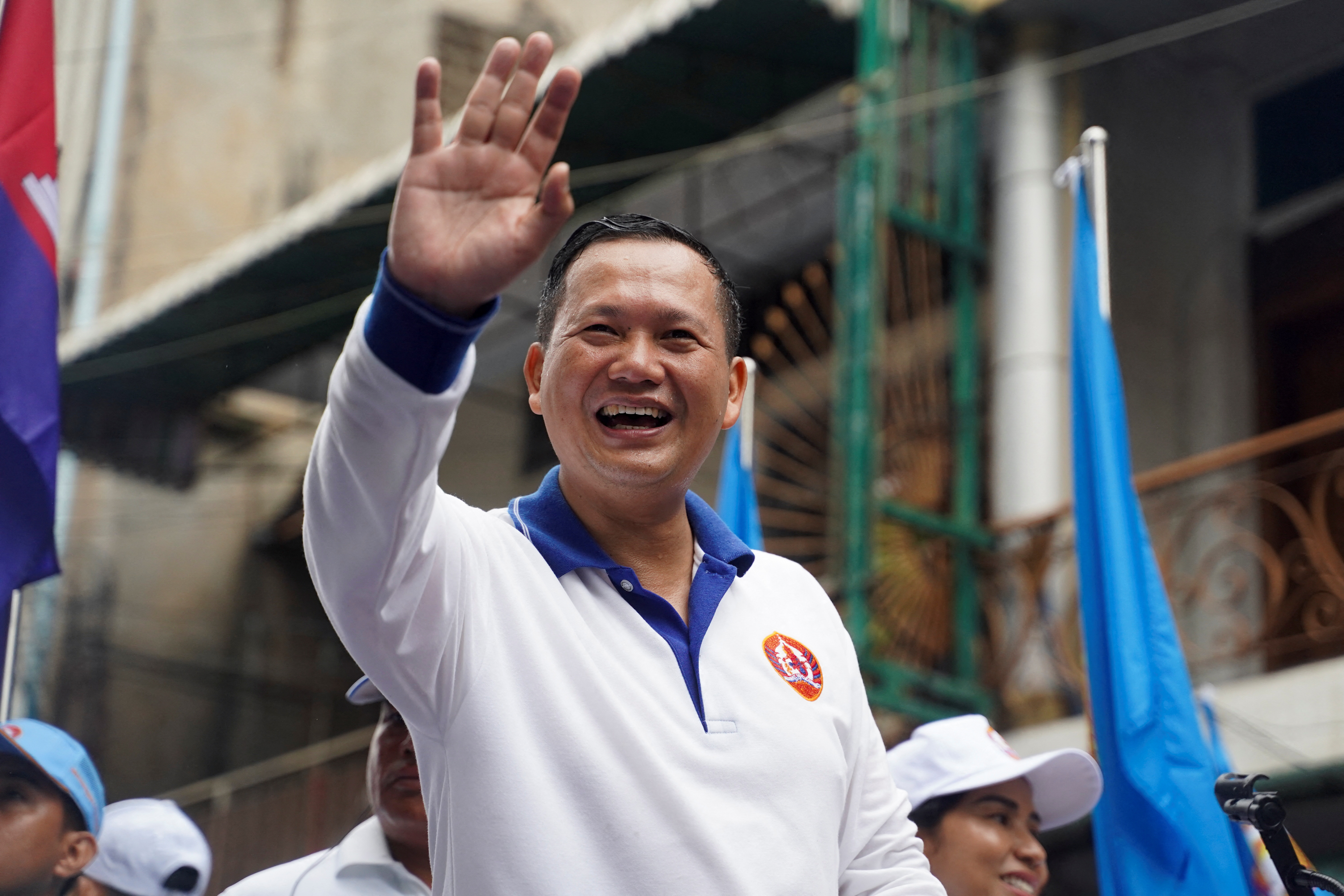 洪曼尼特,柬埔寨總理洪森的兒子,在2023年7月21日柬埔寨金邊舉行的即將到來的大選的柬埔寨人民黨(CPP)最後一次競選活動中向人們揮手。REUTERS/Cindy Liu/檔案照片