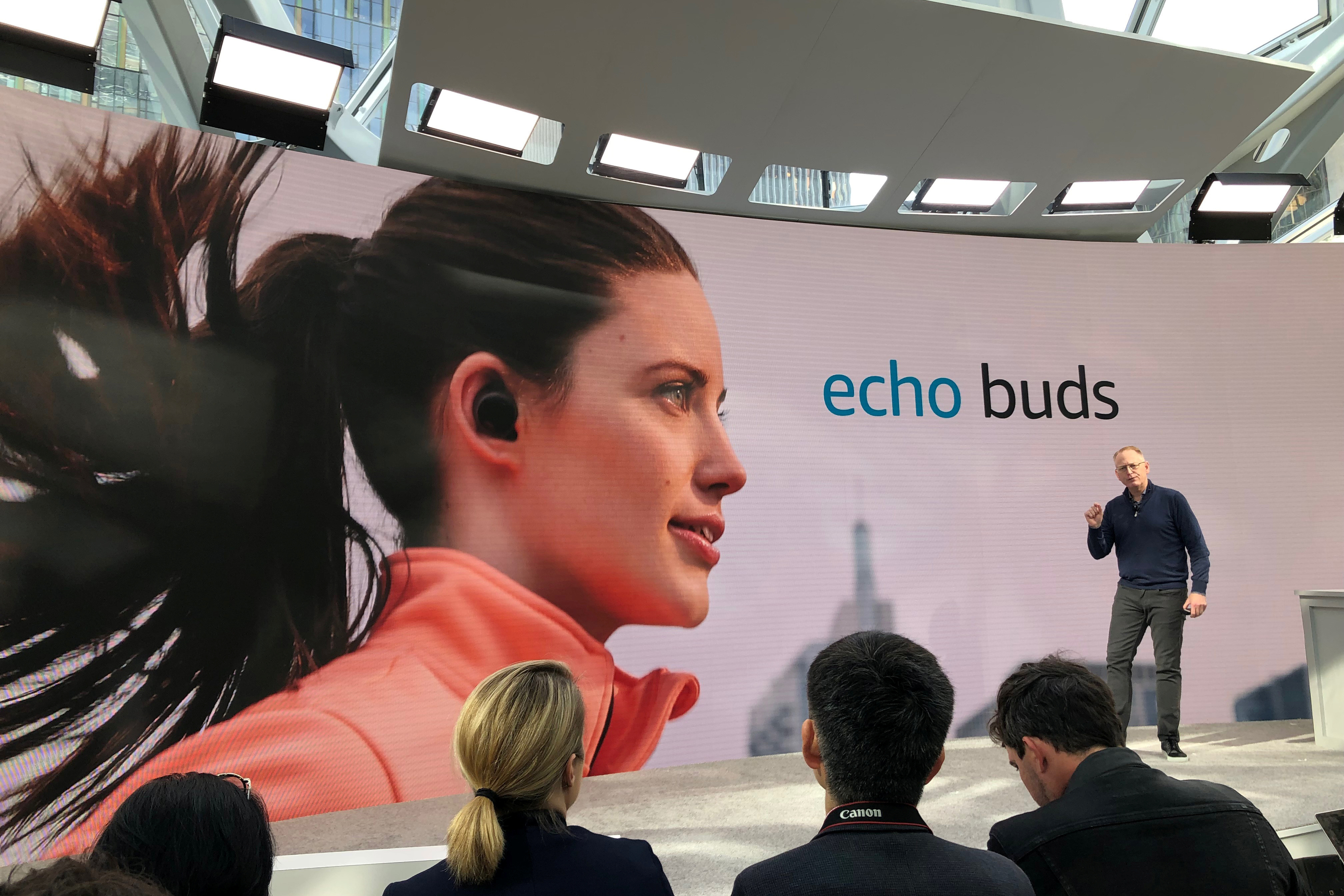 亞馬遜高級副總裁大衞·林普在美國華盛頓州西雅圖總部的產品發佈會上宣佈“Echo Buds”耳機,該耳機內置了該公司的虛擬助手Alexa。2019年9月25日,美國華盛頓州西雅圖,路透社/Jeffrey Dastin/文件照片