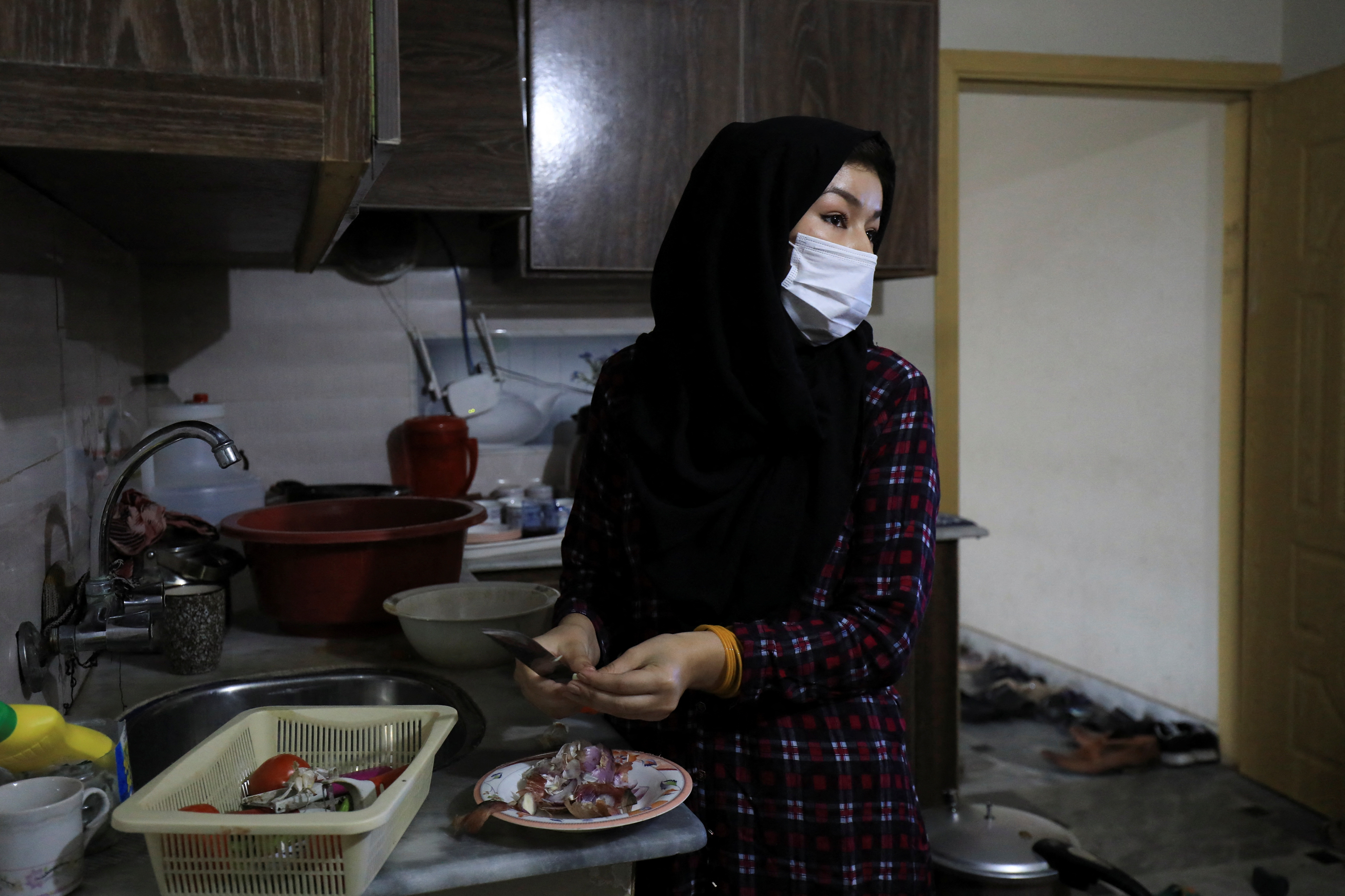 在一個小廚房裏,18歲的瑪爾瓦,她的父親曾在一家美國援助組織擔任保安,正在切菜。