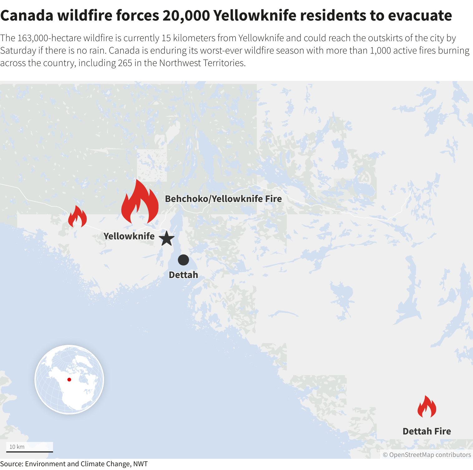8月17日(路透社) - 在星期四,黃刀鎮有2萬多人撤離,消防人員正在努力阻止野火蔓延到該市,這是加拿大最嚴重的火災季節的最新篇章。撤離北加拿大城市的情況。