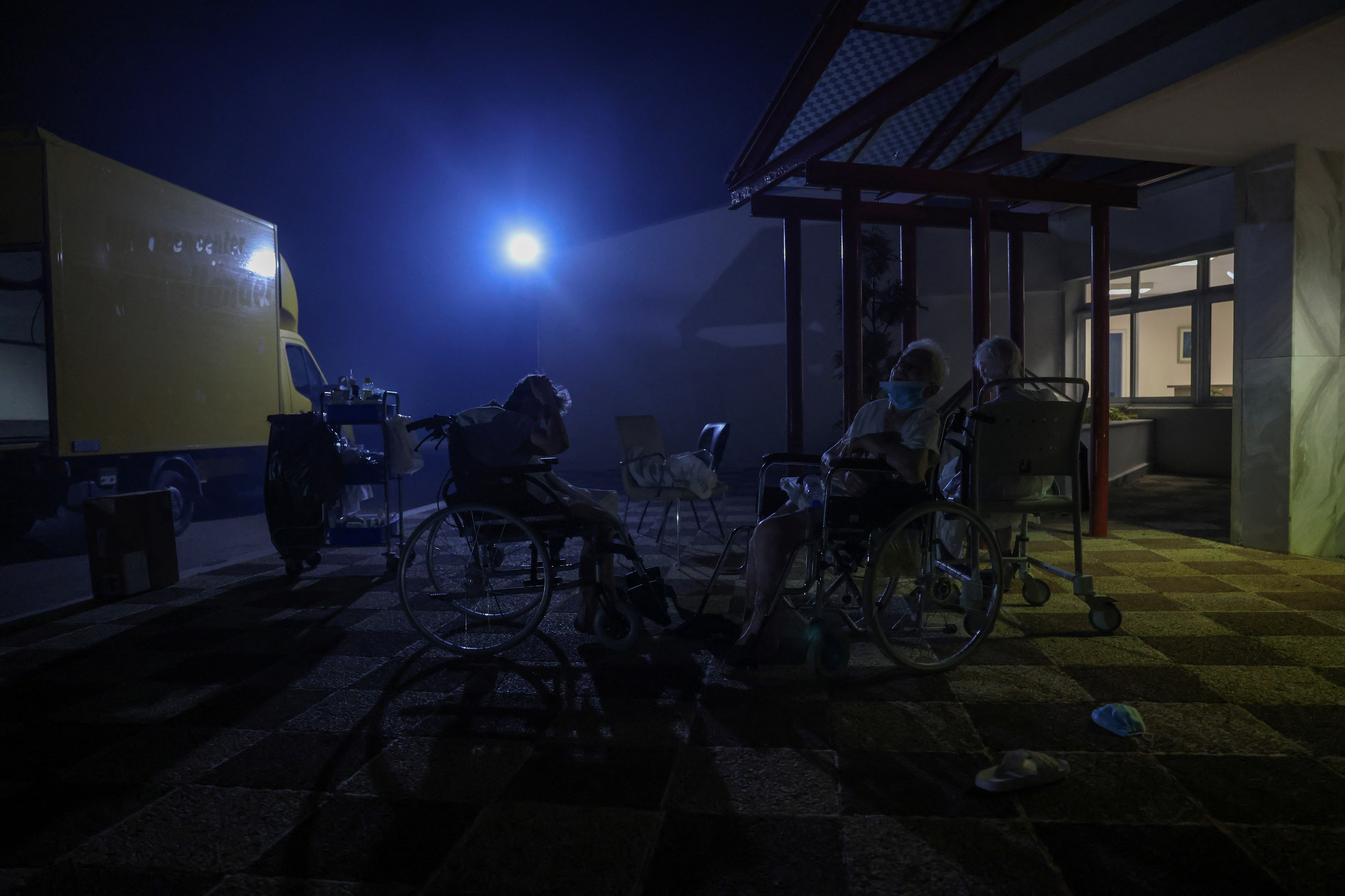 隨着火焰逼近亞歷山德魯波利斯大都會教會基金會的另一家診所,夜間,工作人員將一名男子推上輪椅送上救護車,其他人則被用擔架疏散。