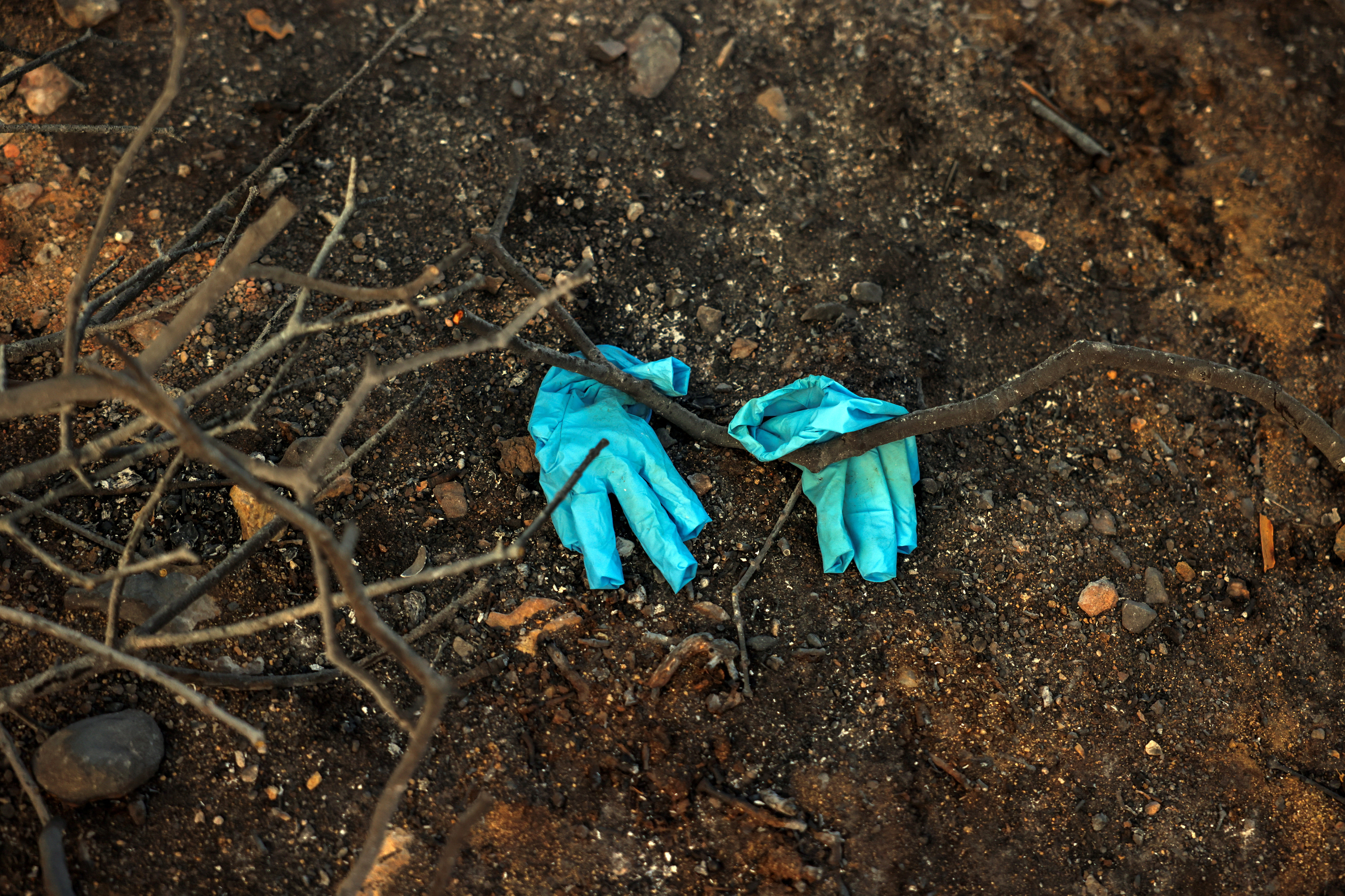 在發現屍體的區域中唯一的一抹色彩是調查人員留下的兩隻藍色醫用手套。