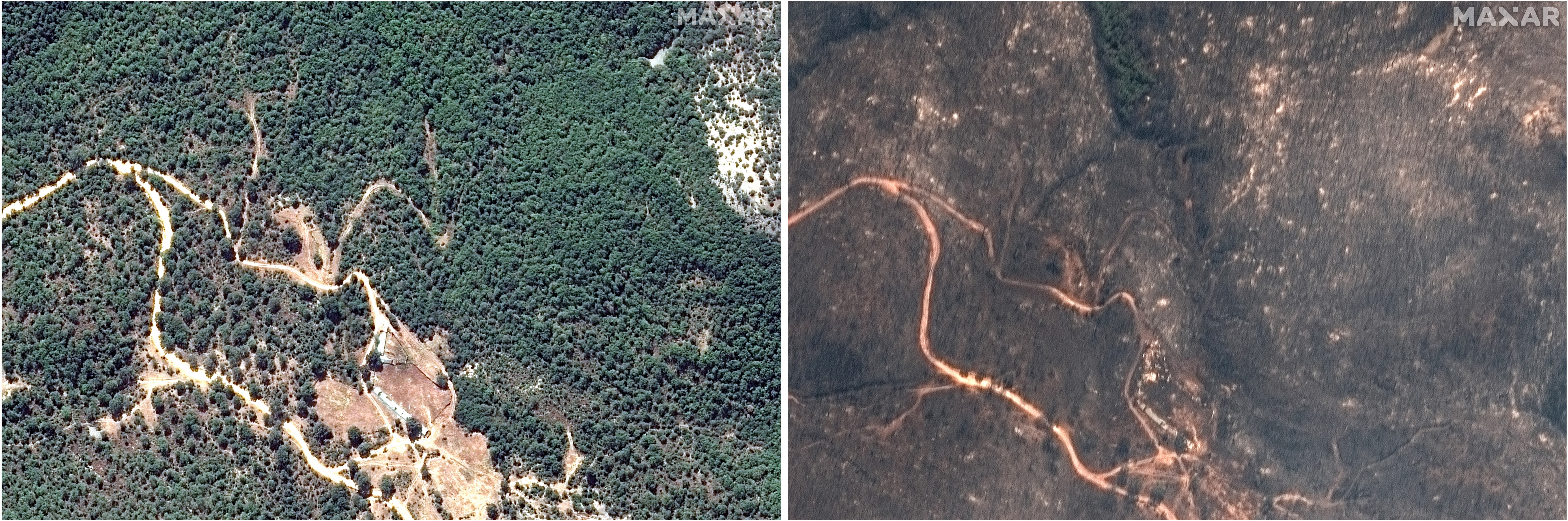 野火前後的衞星圖像顯示了這條路線上造成的破壞,這條路線在中東和亞洲的移民中很受歡迎。