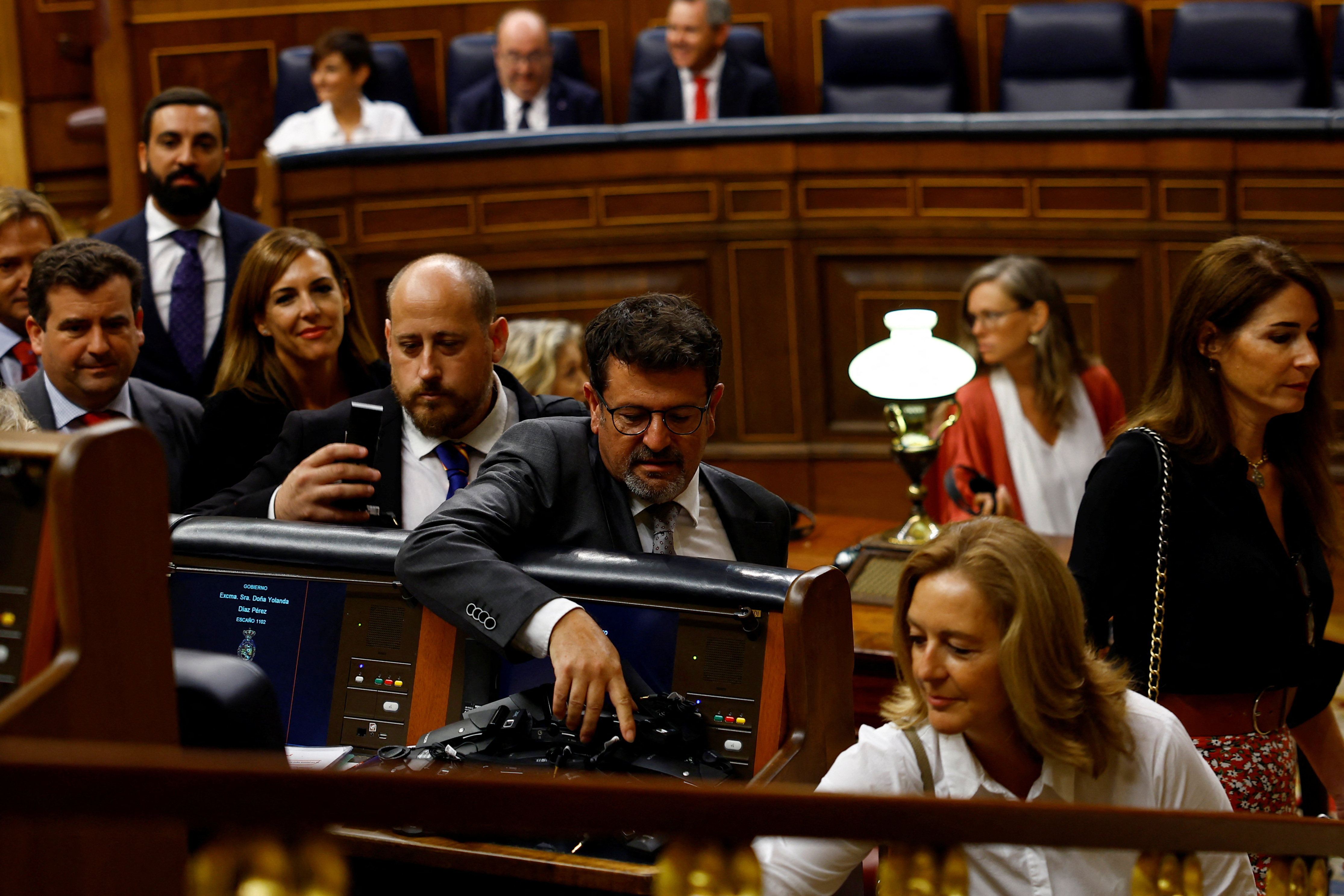 西班牙極右翼政黨Vox成員在西班牙馬德里議會首次提供同時翻譯的第一天,議員在加利西亞語發言後,將他們的翻譯耳機留在了代理總理佩德羅·桑切斯的空座上,2023年9月19日。 路透社/蘇珊娜… 閲讀更多