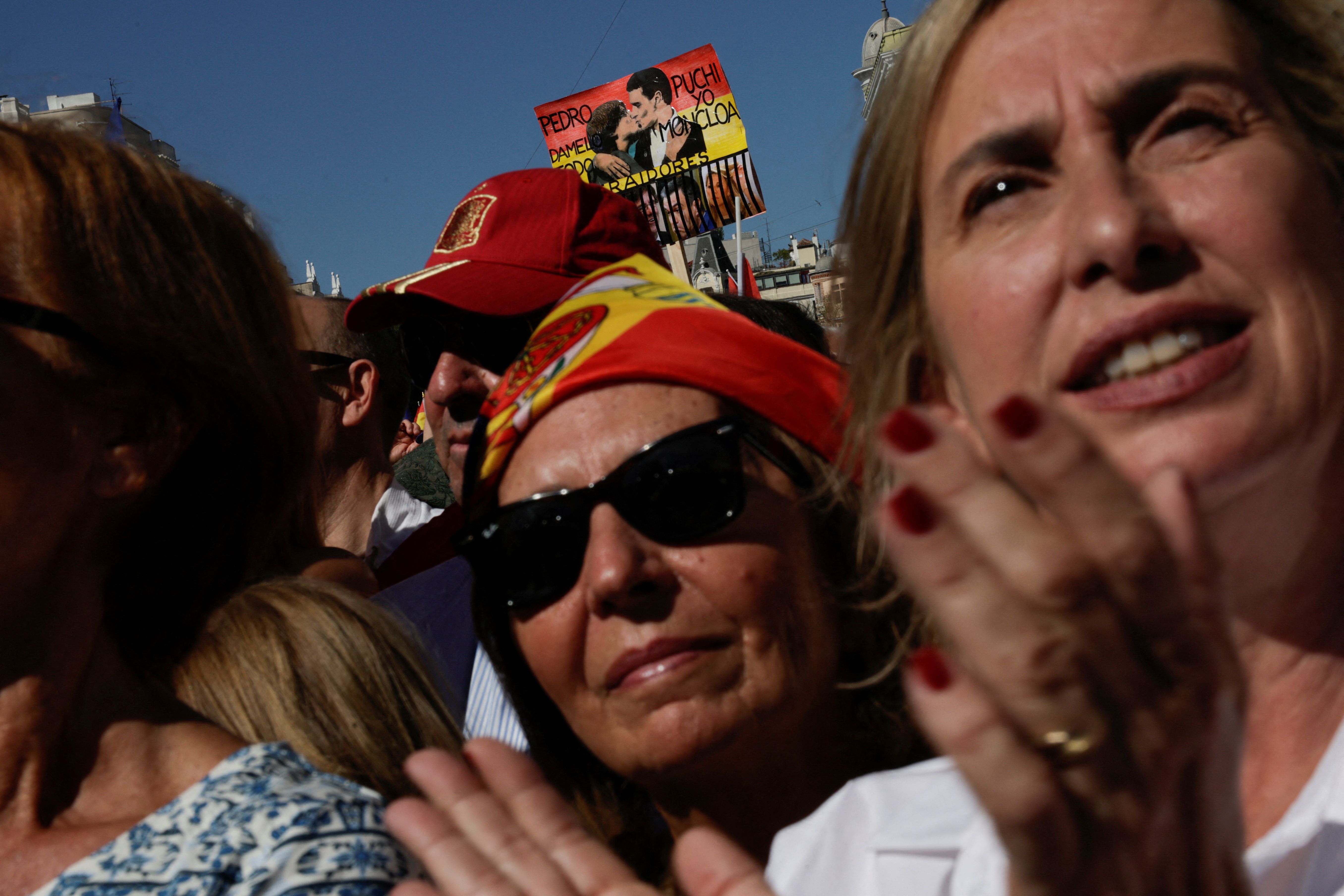 馬德里,9月24日(路透社) - 成千上萬的西班牙人週日在馬德里舉行抗議活動,抗議現任總理佩德羅·桑切斯可能計劃對加泰羅尼亞分裂分子實行大赦,以在他未能贏得的選舉後繼續留任。