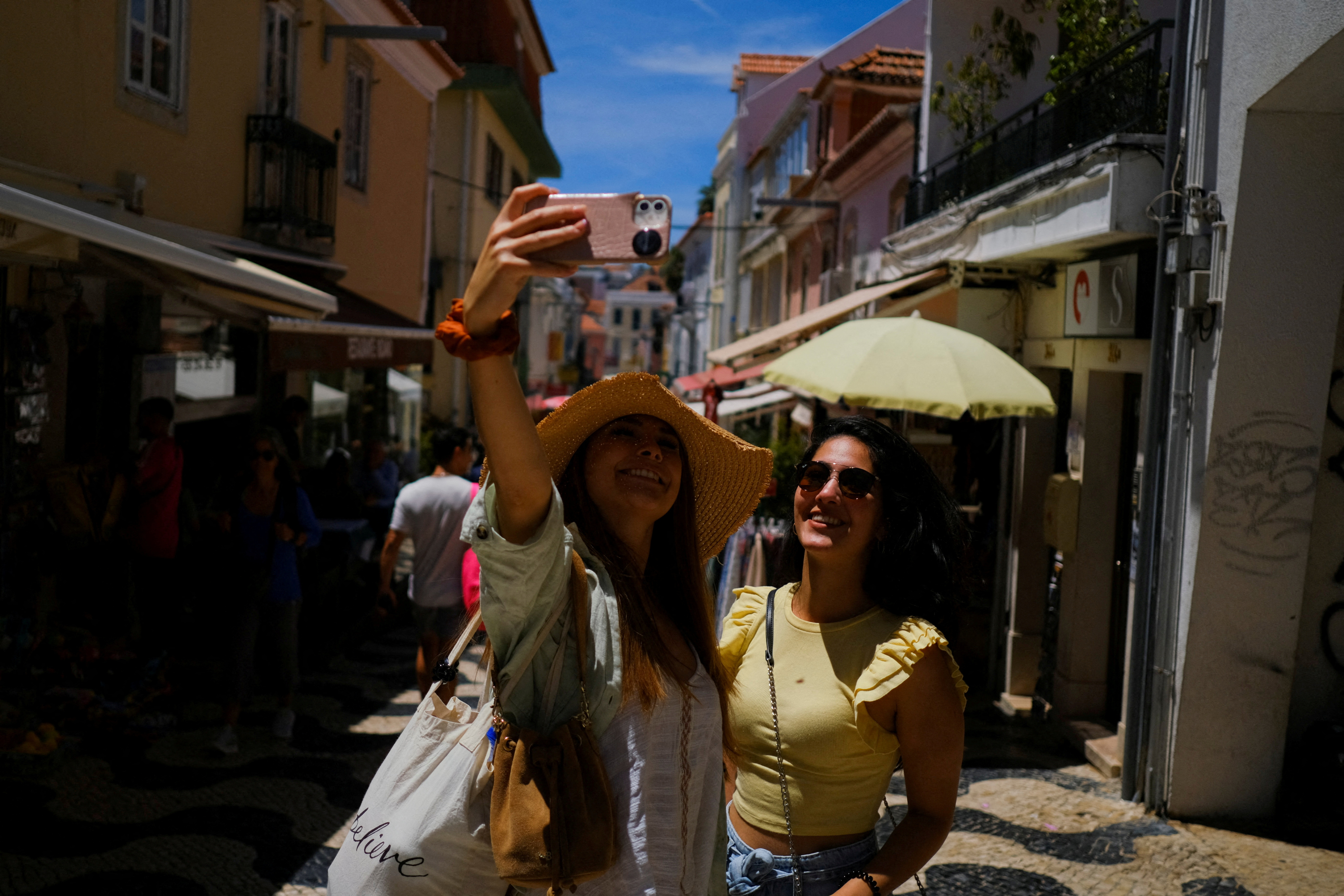 遊客在葡萄牙卡斯凱什的街頭拍照,2022年6月6日。照片拍攝於2022年6月6日。路透社/Pedro Nunes/文件照片