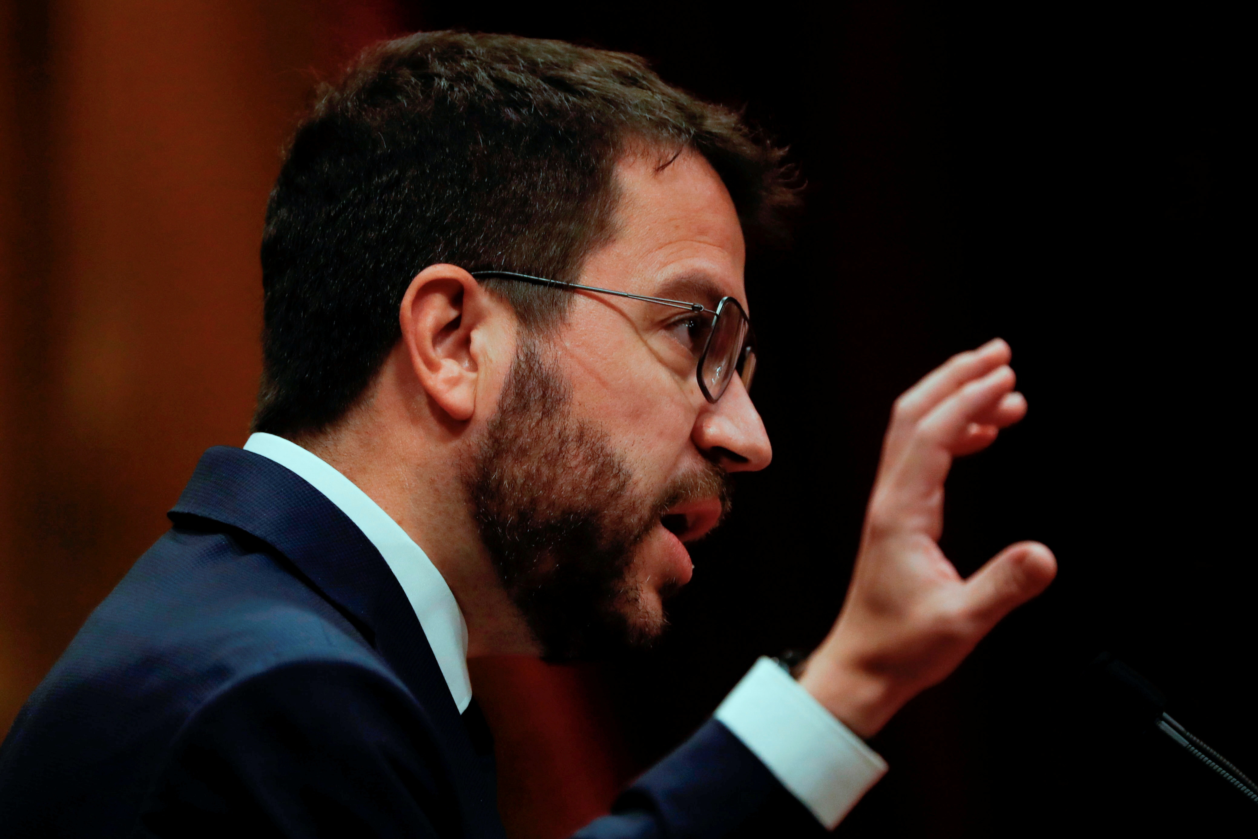 共和左翼黨(ERC)的加泰羅尼亞領袖佩雷·阿拉戈內斯在西班牙巴塞羅那的加泰羅尼亞地區議會進行投資辯論,2021年5月21日。阿爾貝託·埃斯特維斯/路透社/檔案照片