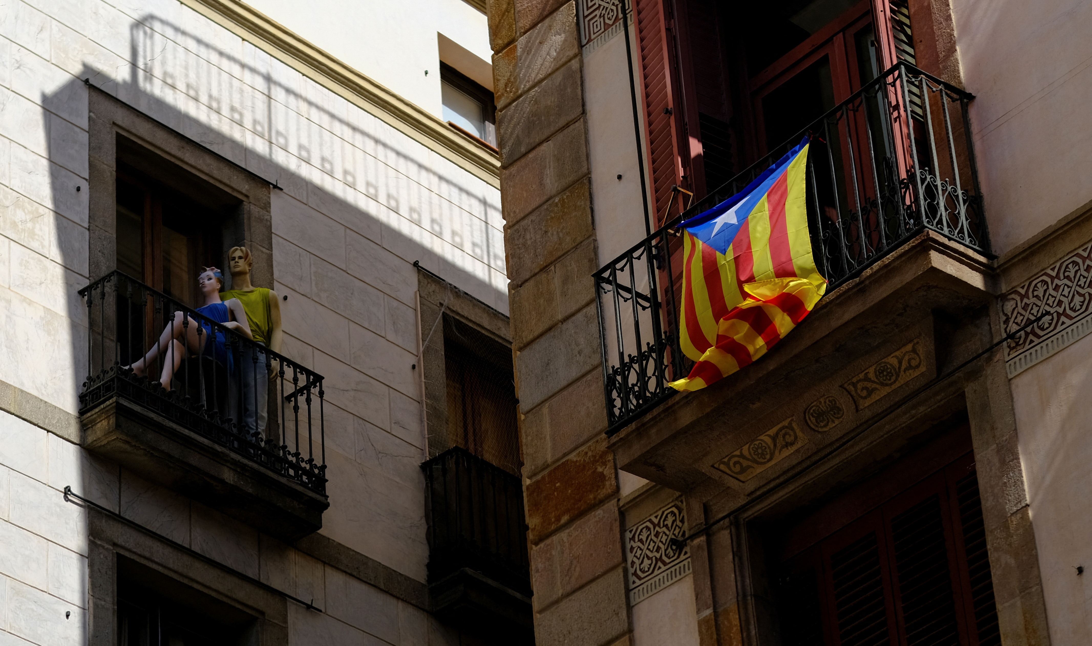 模特被拍攝於西班牙巴塞羅那市中心的陽台上,陽台上掛着一面加泰羅尼亞分裂主義旗幟(Estelada),2023年9月23日攝。REUTERS/Nacho Doce/文件照片