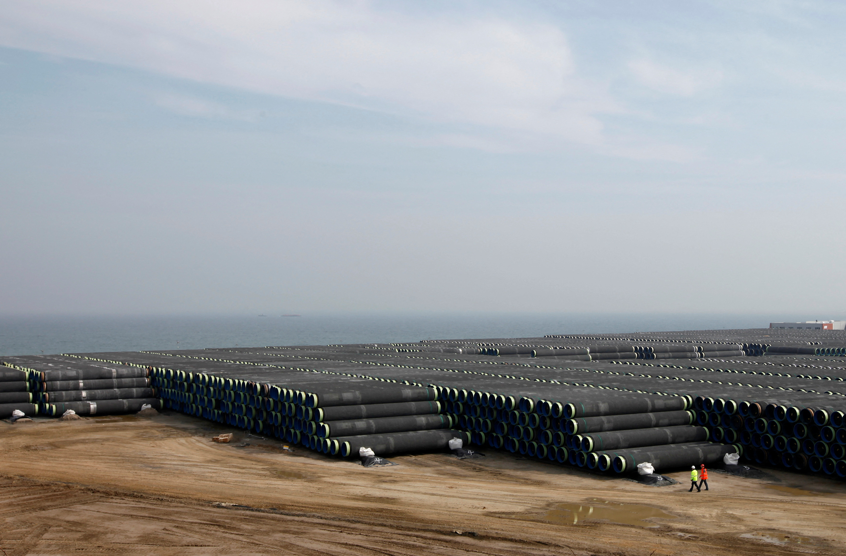 技術人員在波羅的海魯根島的一個儲存設施旁邊走過Nord Stream管道的管道,時間為2010年4月8日。路透社/克里斯蒂安·查裏修斯/檔案照片