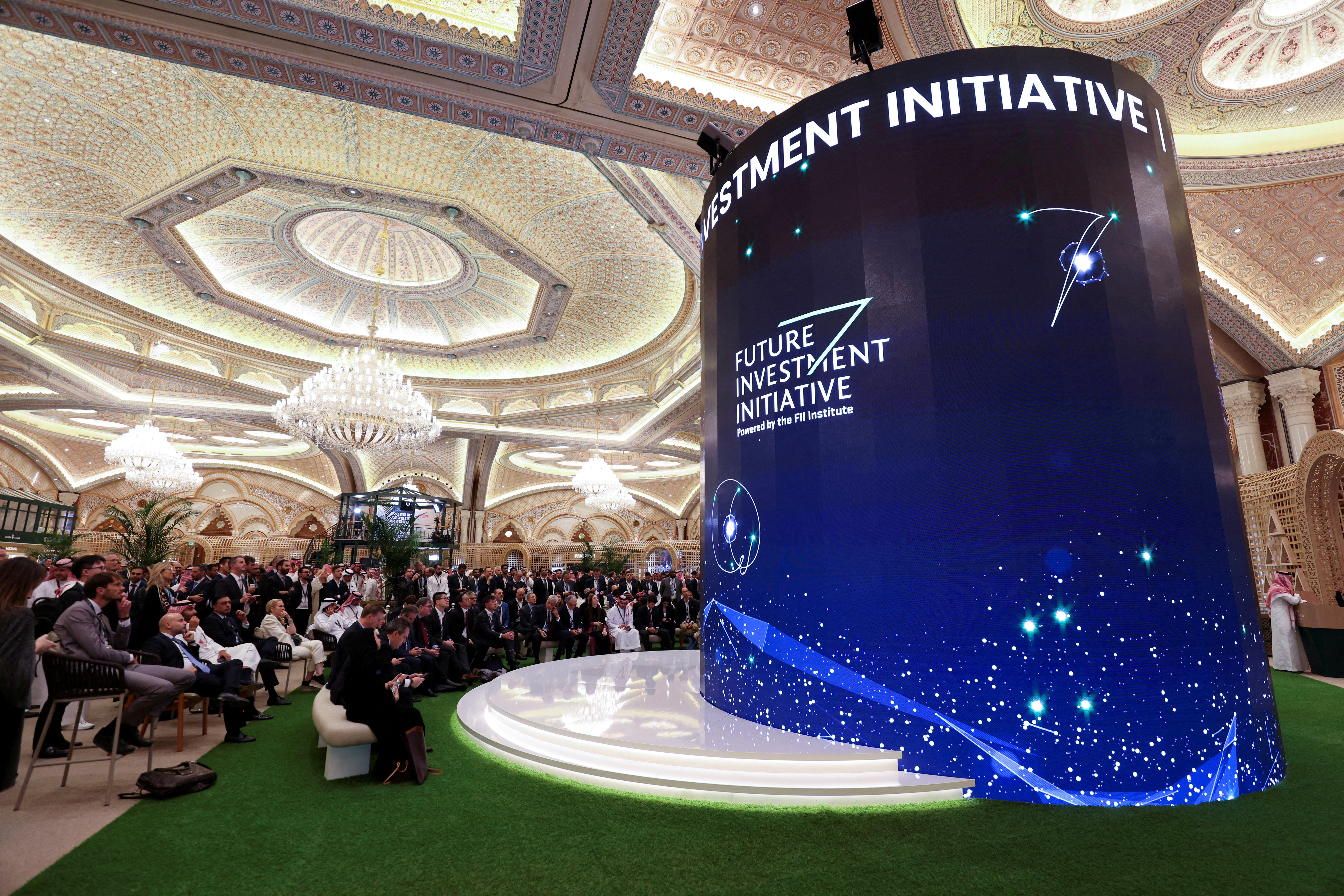 參與者們在沙特阿拉伯利雅德麗茲卡爾頓酒店展覽和會議中心大堂的數字屏幕上觀看未來投資倡議(FII)大會的開幕式,2022年10月25日。路透社/艾哈邁德·約斯里/文件照片