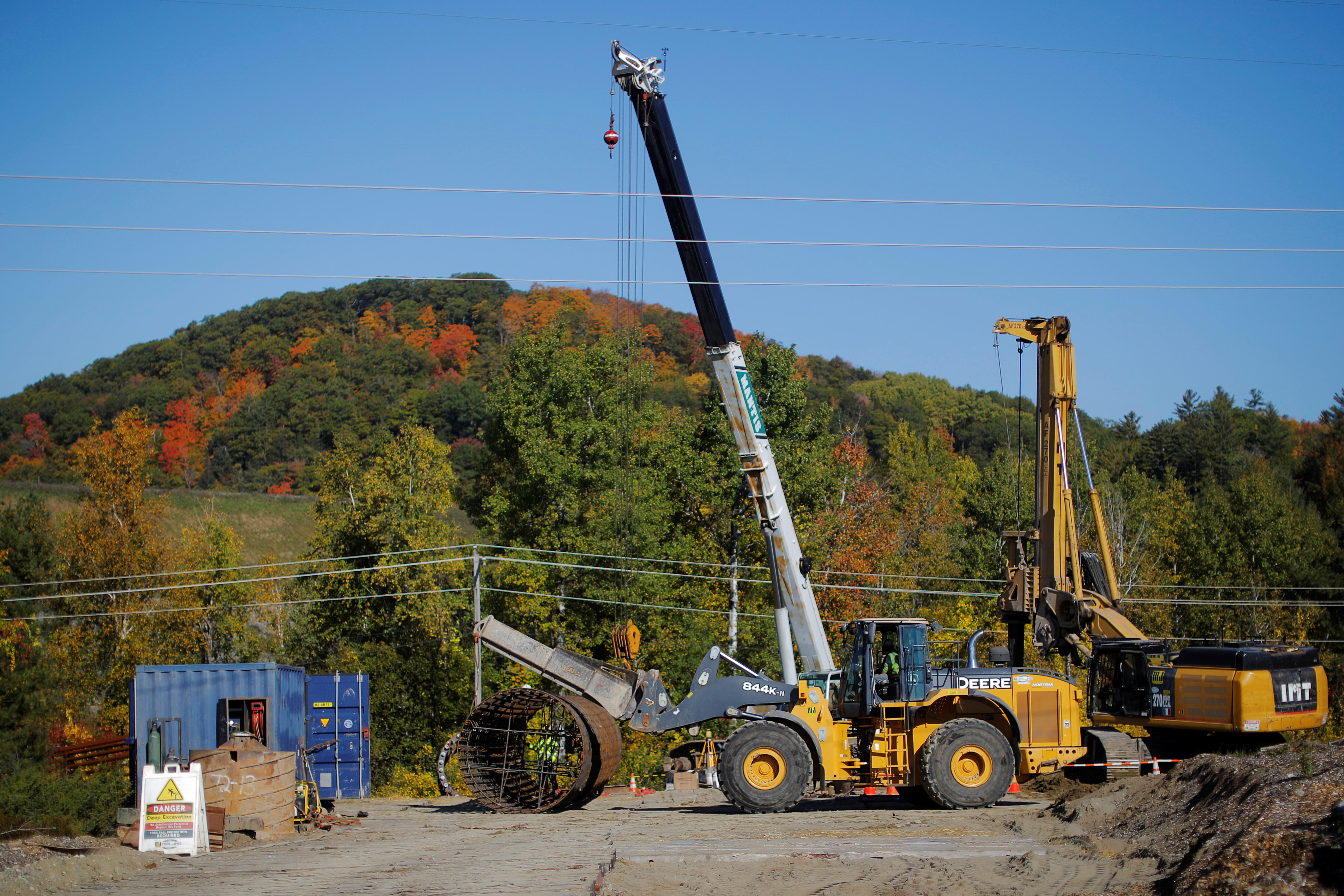 工人們正在為新英格蘭清潔能源連接項目(也稱為清潔能源走廊)安裝輸電線路的新支柱基礎,該項目將把水力發電引入新英格蘭電網,地點位於美國緬因州的莫斯科,2021年10月7日。路透社/Brian Snyder/文件照片